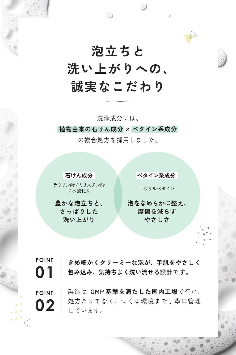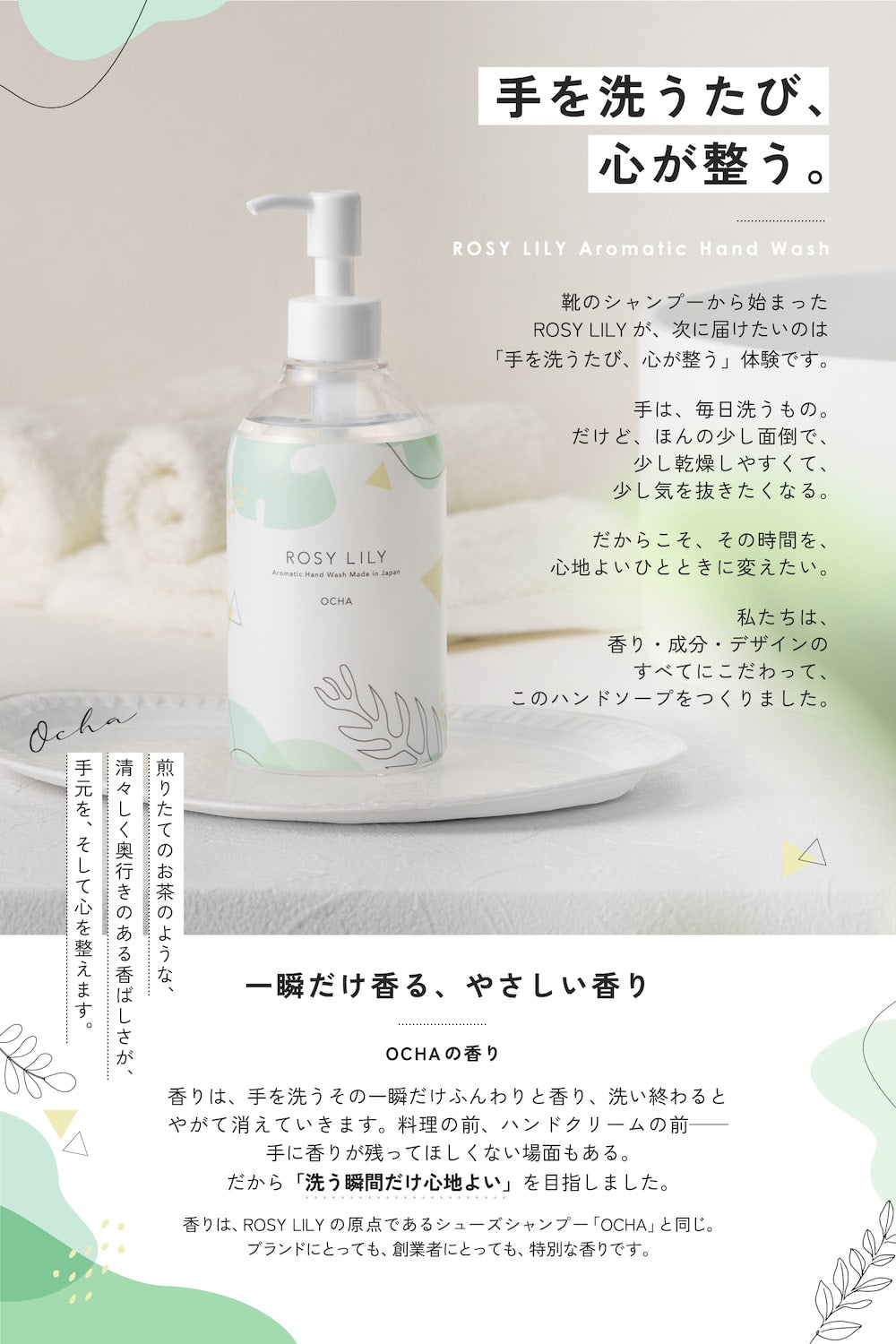 植物由来の成分を配合し、乾燥しやすく、頻繁に洗浄が必要な手肌に適したハンドウォッシュです。肌にうるおいを残しながら、しっとりと洗い上げます。適量をよく泡立てて洗い、水またはぬるま湯で洗い流してください。